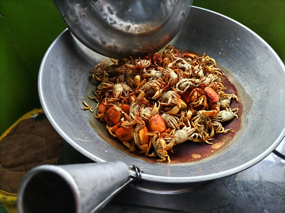 ほんの30分ほどでバケツはいっぱい。フライパンでゆでガニ、そしてそのまま香ばしく焼き上げる。