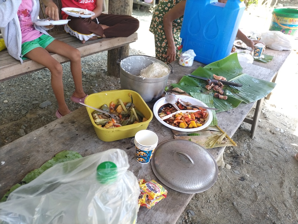 自宅から持参のご飯をみんなのプレートによそい、同じく持ち込んだ煮物や野菜をおかずにランチを楽しむ。バナナの葉っぱをまな板代わりにするのもフィリピン流だ。家族・親戚との貴重な一日を満喫できた。
