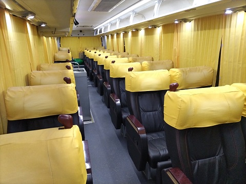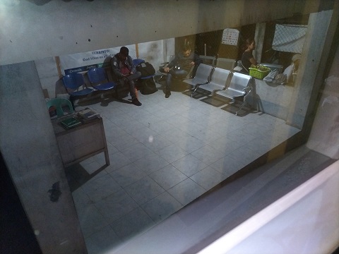 バスに乗り込んだあと車窓から待合室の様子を撮影した。冷房もない待合所でもあり、またほとんどの客は自宅からバスターミナルに到着後すぐにバスに乗り込むので待合室の客はまばらだ。