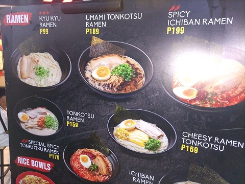 基本の九州ラーメンは99ペソ(270円)。他にとんこつラーメンというメニューが159ペソ(430円)だ。日本人の感覚では九州ラーメンもとんこつラーメンも同じなのだが、写真を見る限り、この店のネーミングではとんこつラーメンにはたまごと紅ショウガが追加されるようだ。(とんこつラーメンの写真を見る限りでは赤い物体がなんなのか特定が難しいが、他に心当たりがないのでおそらく紅ショウガということなのだろう。)