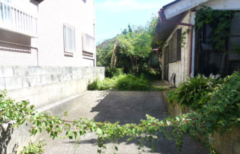 まずは外観について。以下は別アングルからの前面駐車場の画像ですが、スロープから先が完全に雑草で覆い尽くされています。尚、実際の物件購入はこの写真撮影のあと2年が経過しておりましたので、正面の雑草は左側にあるブロック塀の高さまで到達していました。そして空き家を購入した2020年6月は、週末だけ勝浦に通う生活を続け、家族総出で一ヶ月かけてようやく庭の清掃を終えました。