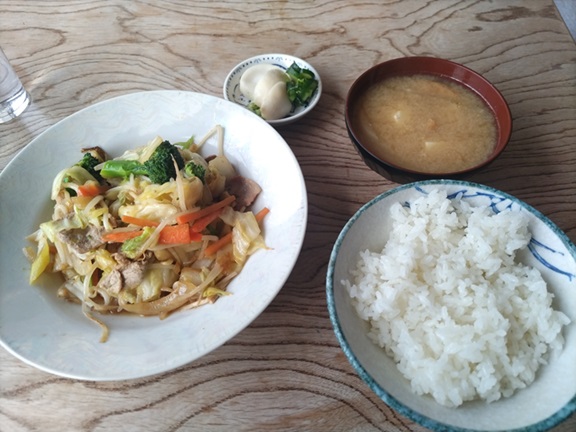 妻は野菜炒め定食を注文。みそ汁と漬物付き。おいしそうです。