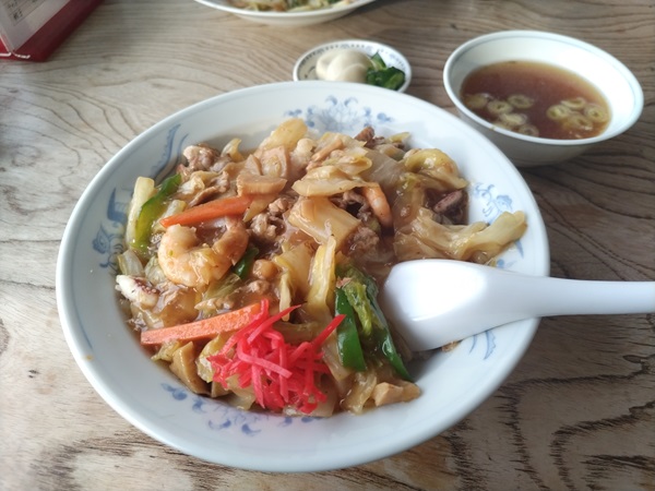 一方、私は中華丼を注文。大盛りごはんの上に具材はエビやイカの海鮮も。味は少し薄味気味なものの、十分うまい。汁物はみそ汁でなく中華スープ。