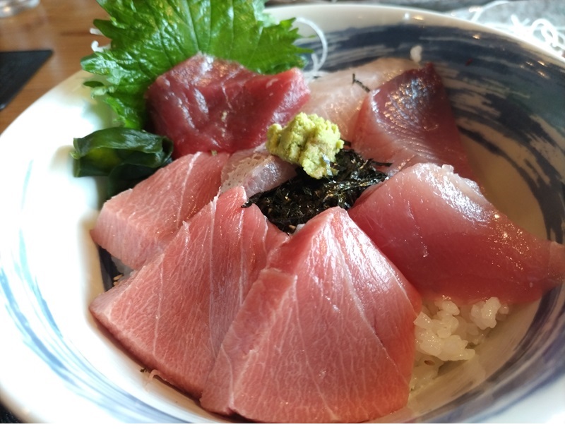では実食。さっそく刺身をごはんの上にランディング。やっぱりネタの最高峰のトロは一番手前の玉座に君臨がふさわしい。大葉もアクセントとしてはずせない脇役。そしてオリジナル丼の完成。いやはやどう見てもうまいでしょ!