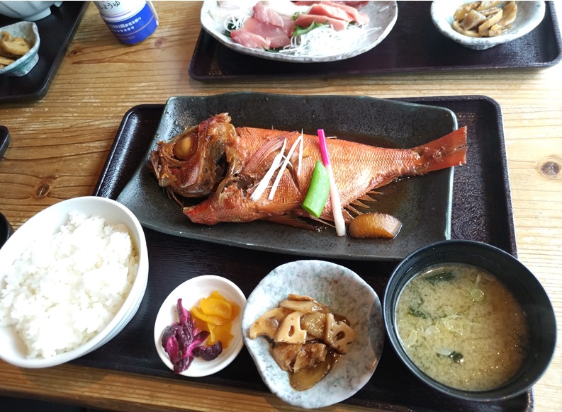 そして妻はというと金目鯛の煮つけ定食を注文。値段は3000円。彼女はどちらかと言うと刺身より火を入れた魚の方が好み。写真からはサイズ感が伝わらないとは思いますが、地元で唯一のスーパーであるベイシアで買ったら鮮魚で2000円くらいはしそうなサイズ。