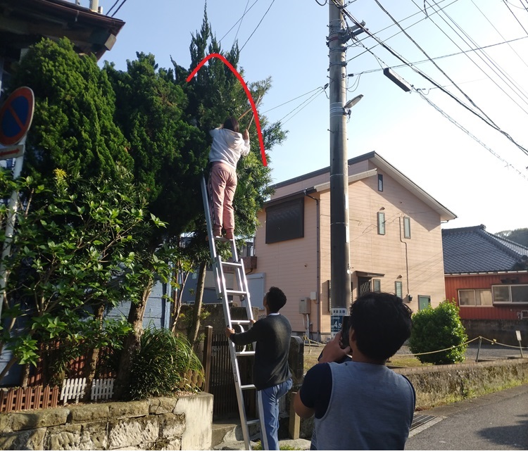そしてようやく庭木の剪定に着手できました。家族総出で手分けして作業。最初は息子が剪定バサミを手に格闘するものの、コツがつかめないと案外難しい。妻が選手交代。さすが普段から空き家再生ドットコムの作業を通して培った経験も手伝いなんなくバサバサ切っていく。赤い線から飛び出した枝を容赦なく切り捨て。